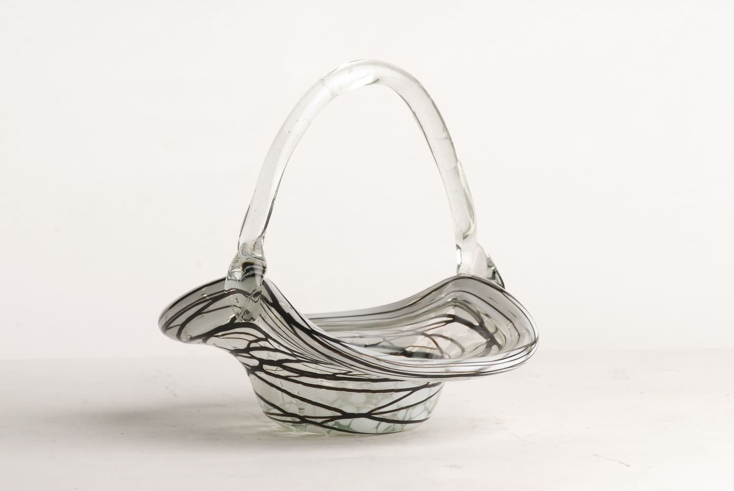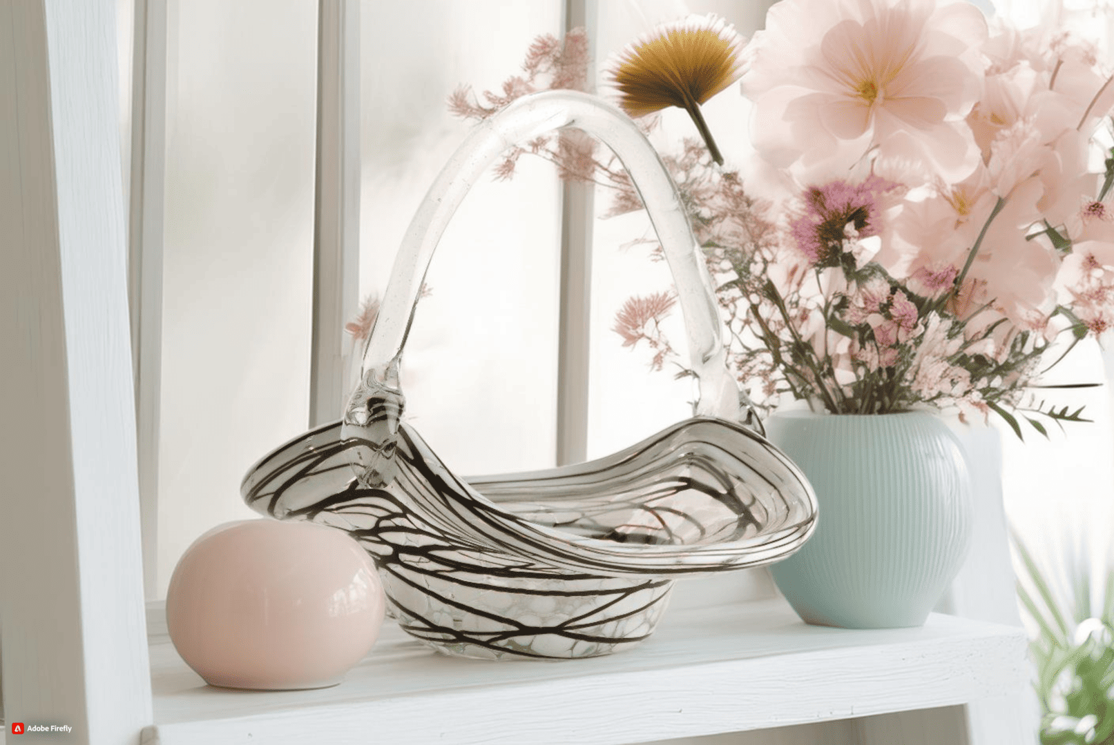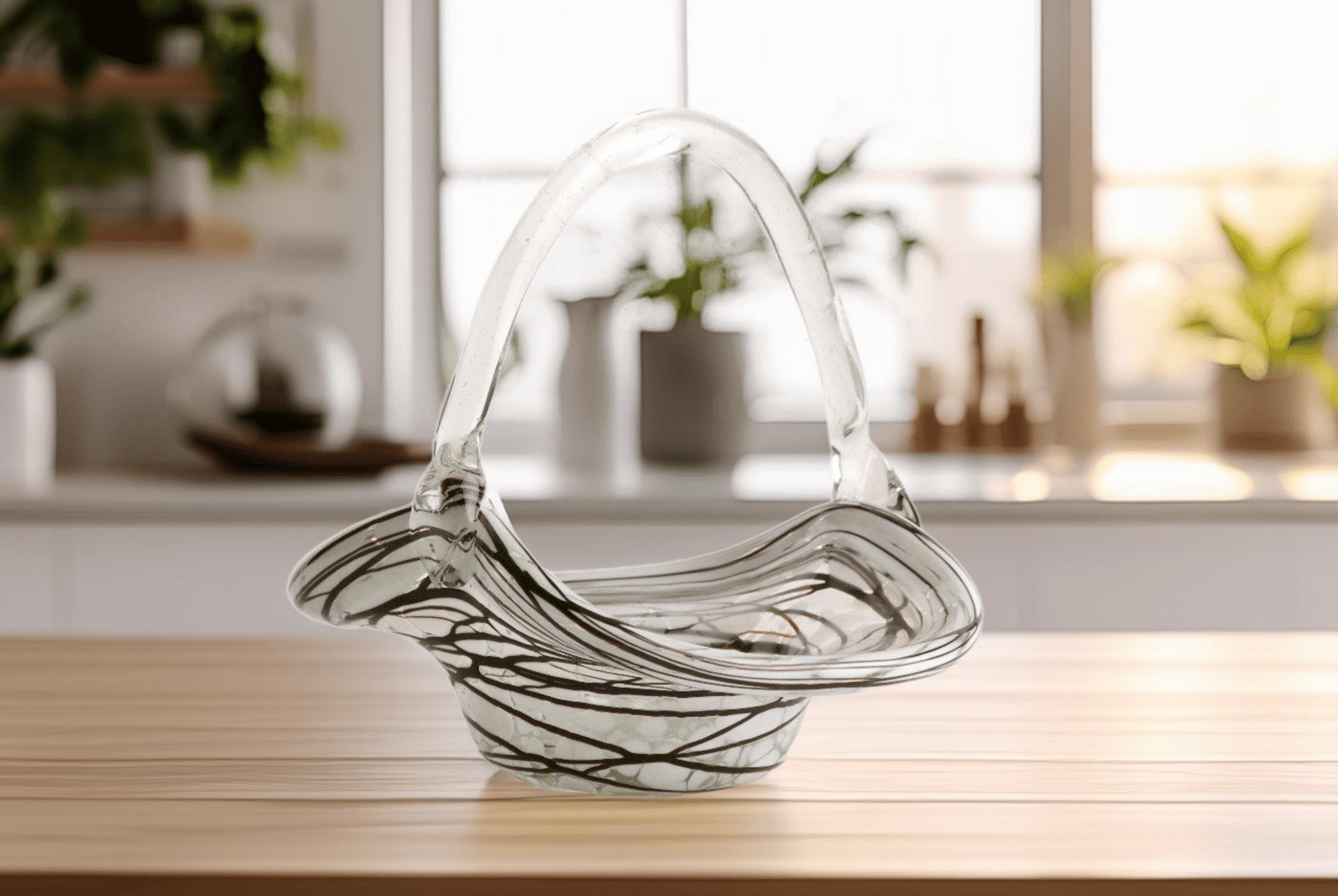 Add a touch of elegance to your home with this handcrafted glass basket. Featuring swirling patterns and a graceful handle, it’s both functional and decorative.