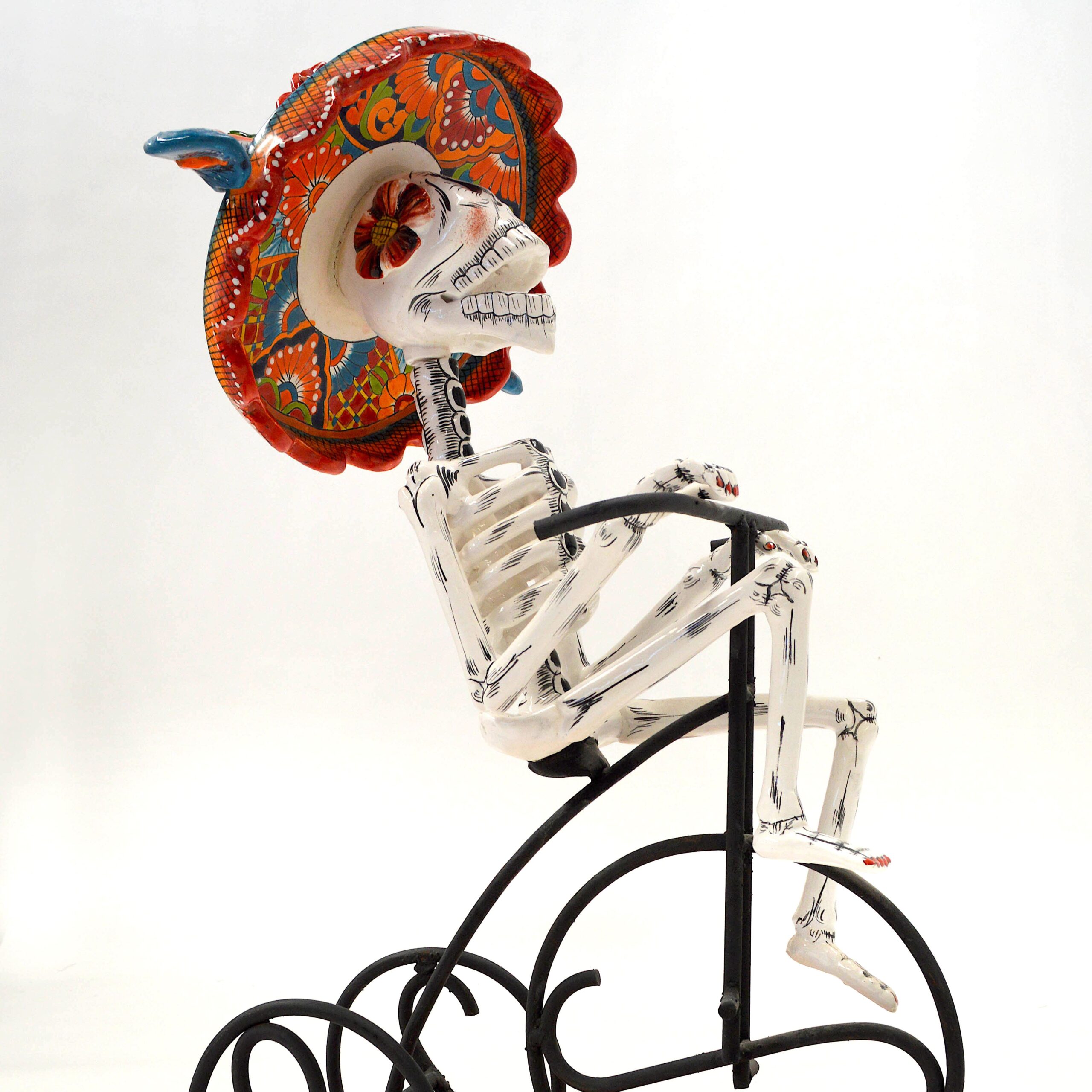 Experience the dynamic blend of movement and Mexican artistry with the Ciclista figurine. This lively depiction features a whimsical skeleton pedaling a classic bicycle, showcasing vibrant, hand-painted details that capture the essence of joyful motion. Crafted from high-quality ceramic and metal, this unique piece adds a burst of color and charm to any space, making it a perfect celebration of life and cultural heritage.