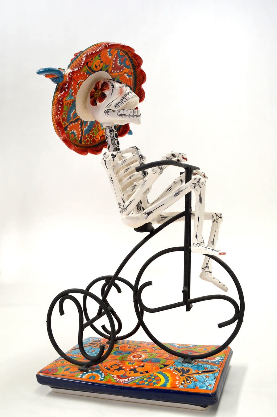 The Ciclista figurine features a skeleton on a classic bicycle, blending Mexican tradition with vibrant artistry. This unique piece is both dynamic and decorative.