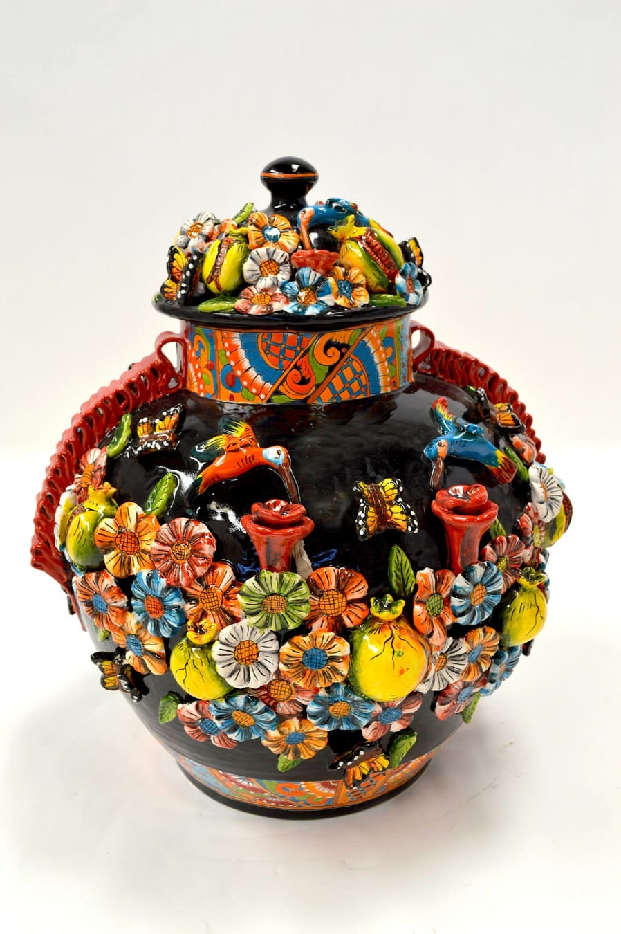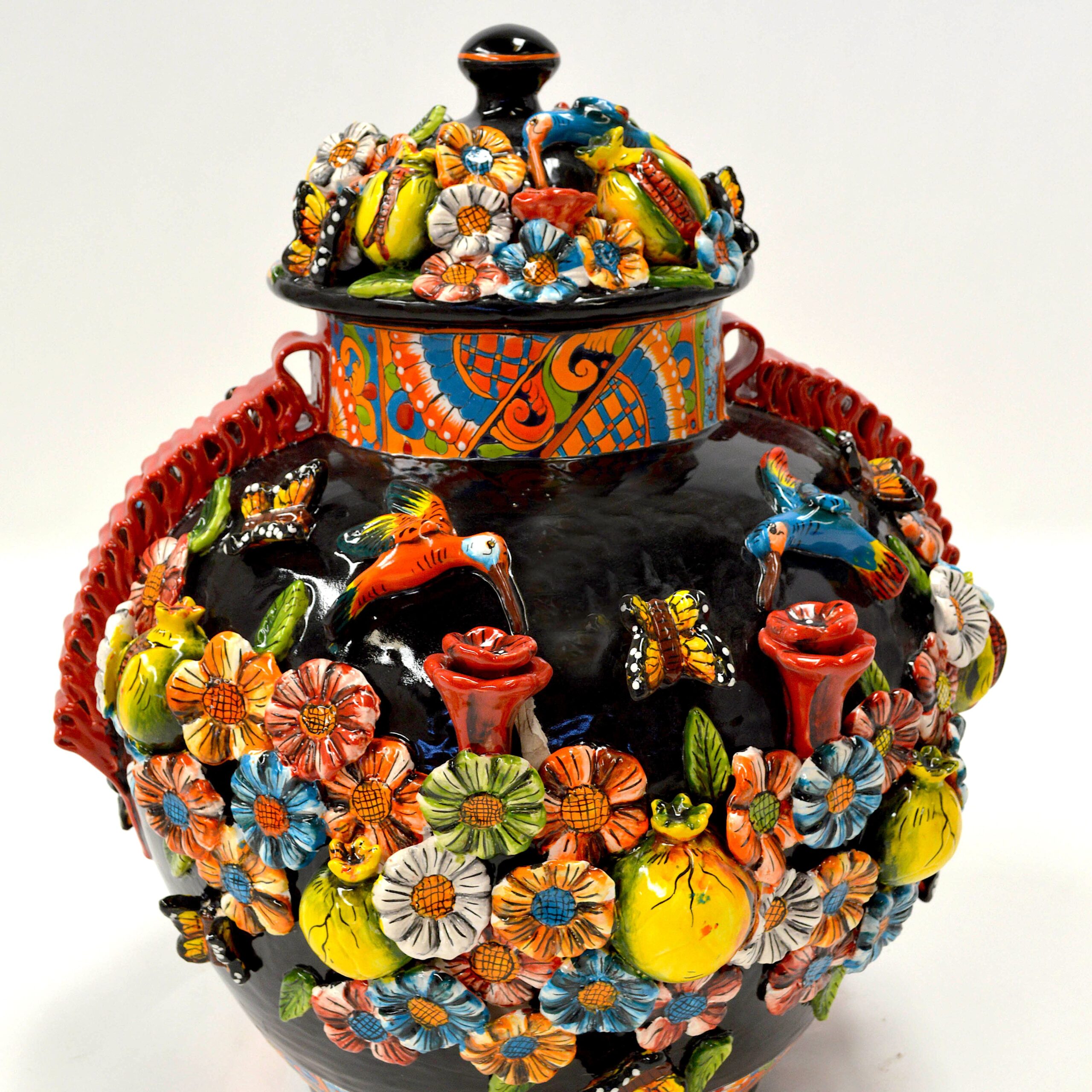 The Conservera ceramic vase is a vibrant centerpiece featuring intricate floral and bird designs. Handcrafted by Mexican artisans, it’s both functional and decorative.