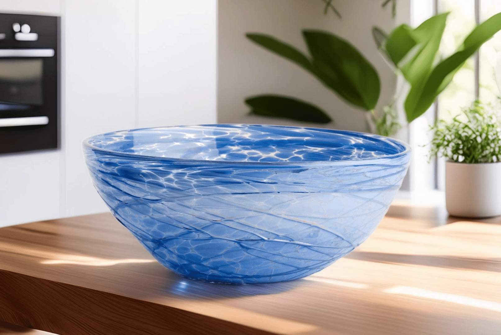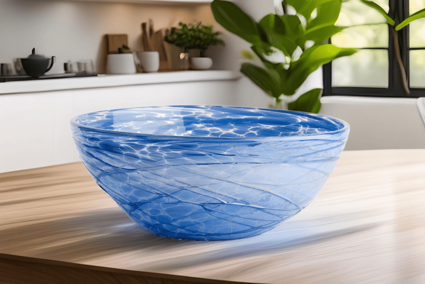 The Glass Salad Bowl Blue combines functionality with artistry. Its hand-blown design and swirling blue patterns make it the centerpiece of any table.