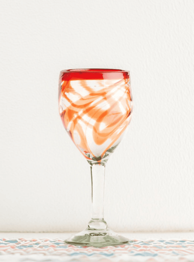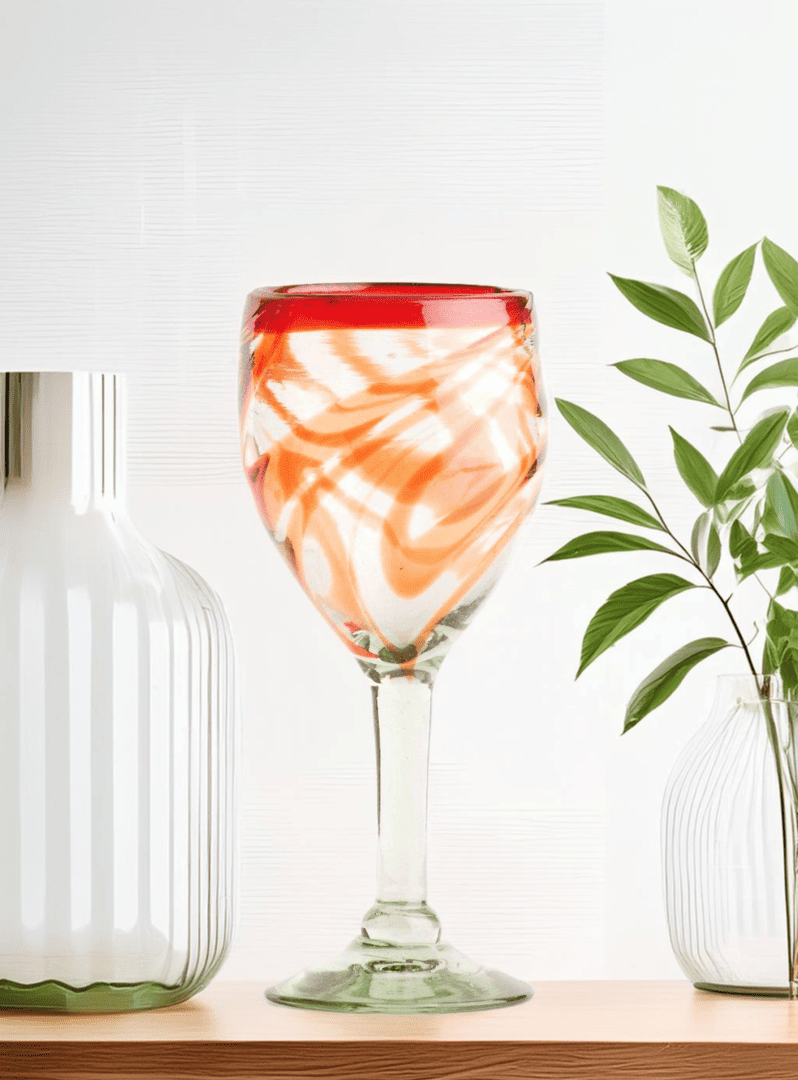 Elevate your wine experience with this elegant glass, featuring vibrant orange swirls that add a touch of artistry to every sip.
