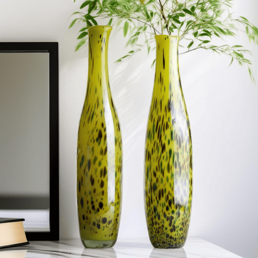 The Vase Polo Dots Set features hand-blown glass with lively dotted patterns. This set adds a fun yet sophisticated touch to your decor.